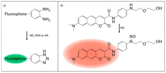 Comparison of a common o-diamino aromatic probe with the new NCNO probe. (a) shows a generic o-diamino aromatic probe that is activated by exposure to nitric oxide (NO), dehydroascorbic acid (DHA), or ascorbic acid (AA); (b) shows the NCNO probe that is also activated by NO, but not by DHA or AA [93].