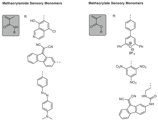 Acrylic polymers belong to the “classical” polymeric materials, and have been analyzed for decades. These kinds of polymers can be used as sensory materials due to their versatility, and also a great variety of sensory units can be anchored chemically to their structure, thus conferring on them numerous advantages. The main acrylic polymers found in sensory applications are polymers prepared with esters of acrylic or methacrylic acid, acrylamide derivatives, and copolymers thereof, as shown in Scheme 1, in which different sensory units that can be precisely anchored to acrylic motifs to later prepare sensory polymers are presented. More examples can be found in the bibliography presented afterwards.