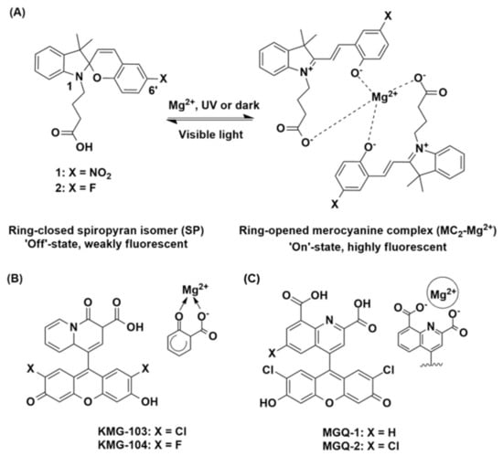 (A) Structures of 1 and 2 as the ring-closed, weakly fluorescent spiropyran (SP, ‘off’) isomer, and the proposed ring-opened, highly fluorescent merocyanine (MC2-Mg2+, ‘on’) complex. Structures of the (B) KMG [29] and (C) MGQ [30] chemosensors with the proposed Mg2+-binding domains highlighted.