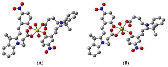 Structures of chemosensors 1 and 2, bound with both Mg2+ and Ca2+, were calculated by density functional theory based on a 2:1 binding of ring opened merocyanine isomer to metal ion (see Figure 1). This proposed coordination geometry has precedent for similarly functionalised spiropyran-based chemosensors with divalent metal ions [47,48,49]. Two water molecules were included in the initial calculations to provide additional coordinating sites, based on the metal-bound crystal structure reported for a similar spiropyran [47]. Geometry optimised structures were obtained using the B3LYP functionals [50] and 6-311G** basis set for all atoms, within the Gaussian09 package [51].