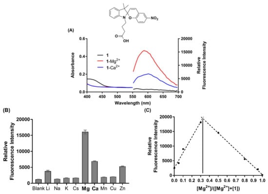 (A) Absorbance and fluorescence emission spectra of chemosensor 1 in the absence (black, 50 µM) and presence of excess Mg2+ (red, 100 µM) and Ca2+ (blue, 100 µM), respectively. (B) Selectivity profile of 1 (50 µM) in the presence of various biologically relevant metal ions (100 µM). (C) Job’s plot analysis of MC(1)-Mg2+ complex, where [SP] + [Mg2+] = 100 µM in acetonitrile. Excitation was at 532 nm, and all experiments were performed under ambient light conditions.