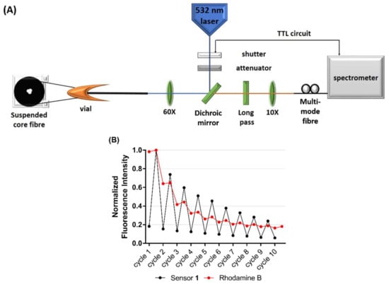 (A) Schematic of the optical setup used to measure fluorescence from a suspended core microstructured optical fibre (SCF). (B) Photostability of chemosensor 1 (500 µM) in the presence of Mg2+ (1 mM) (black), compared to the photostability of Rhodamine B (red) in an SCF. Excitation was at 532 nm, with 10 × 50 ms pulses at 1 mW power. Results are normalised to the highest fluorescence measurement, respectively.