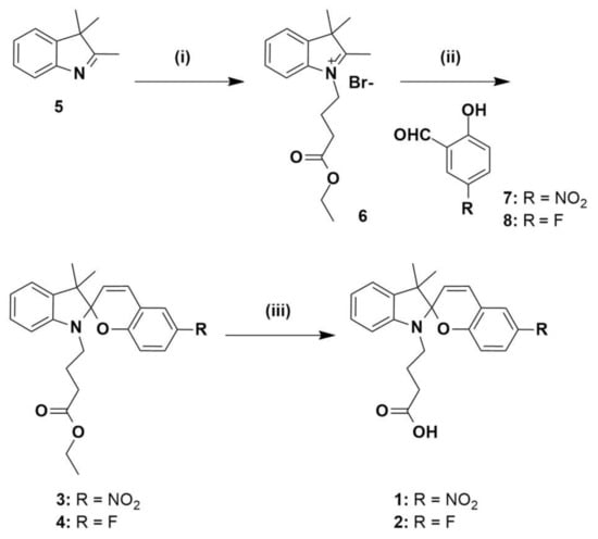 Compounds 1 and 2 were prepared as outlined in Scheme 1. Commercially available 3,3-dimethyl-2-methyleneindoline 5 was alkylated with ethyl-4-bromobutanoate to give the previously reported indoline 6 [38]. Separate condensation reactions of 2-hydroxy-5-nitrobenzaldehyde 7 or 5-fluoro-2-hydroxybenzaldehyde 8, with indoline 6 in refluxing ethanol, gave the ester-protected spiropyrans 3 and 4, respectively which were fully characterised by 1H, 13C-NMR and HRMS (see Figures S1–S4 and S8). Spiropyrans 3 and 4 were then separately treated with 2 M aqueous NaOH in order to hydrolyse the ester protecting groups, and the crude, free-acid products were then purified by reverse-phase HPLC, respectively. The resulting compounds were characterised by 1H, 13C-NMR and HRMS, with details reported in Supporting Information (Figures S5–S8). The proton NMR spectrum of 1 shows the chemosensor fully in the ring-closed SP form, as is consistent with previous studies [33]. Interestingly, the proton NMR spectrum of 2 suggests a mixture of SP and MC isomers. Based on this, subsequent work was focused on chemosensor 1.