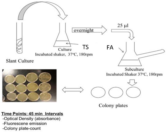 Flow chart for the preparation of the PA14/EGFP culture. From the slant, a swipe of the culture was introduced into 25 mL of tryptic soy broth (TSB) media and incubated at 37 °C on a shaker for 12 h. Then, 25 μL of the culture was added to a side-arm flask with 25 mL of fastidious anaerobe broth (FAB) media and incubated for another 2 h or until an OD600 of 0.03 was obtained. Absorbance readings were taken, and samples were prepared for assaying.