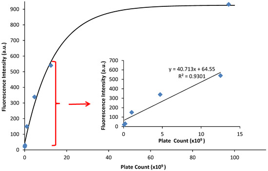 The fluorescence emission was graphed against the CFU/mL, and a linear relationship occurs at low values of fluorescence emission with an R2 value of 0.930 (Figure 4, inset). At higher emission intensities, the CFU values increased faster than the fluorescence intensity, causing a non-linear response (Figure 4). Therefore, a quantitative relationship between optical density and fluorescence emission can only be assessed during the logarithmic growing phase, because that is when the cells begin to grow exponentially, and chemical and physiological properties are the most uniform, such as the production of EGFP. It should be noted that this linear relationship is a calibration curve for PA14/EFGP only. Other strains of PA or other bacterial species would most likely yield a different calibration curve that would have to be obtained prior to any quantification experiments, especially if the stains are not tagged with a fluorophore similar to EFGP, and quantification relies on only the autofluorescence of NADH [55]. Thus, this method has limitations at high CFU counts, where fluorescence intensity may not correlate to a linear curve. Dilution of the samples may be required in order to lead to readings that are within the linear range.