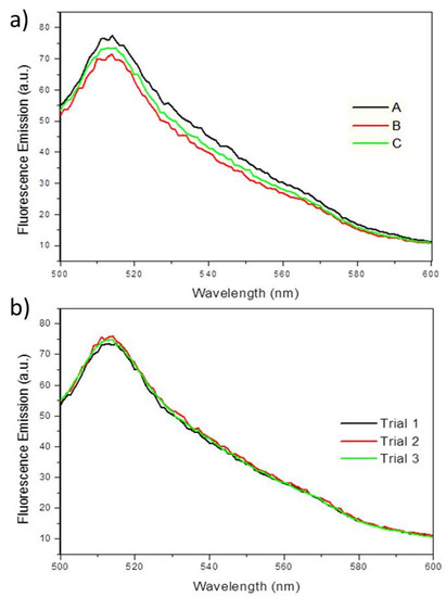 (a) Fluorescence emission spectra showing the fluorescence maxima at 514 nm, when excited at 475 nm for PA14/EGFP on three separate biofilms (A, B, C) grown in a drip-flow reactor. (b) Fluorescence emission spectra showing PA14/EGFP fluorescence maxima at 514 nm over three measurements (Trial 1, 2, and 3) on a single sample. No fluorescence quenching occurs during the replication of experiments within one sample.