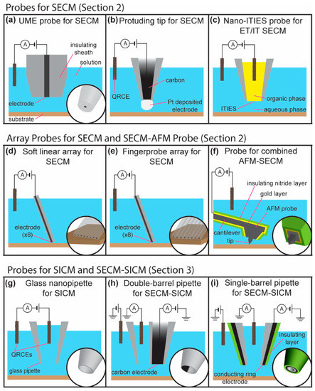 Electrochemical imaging using SEPM employs a scanned probe, with a critical dimension for imaging on the micro- or nanoscale. This size scale allows the measurement of activity heterogeneity across a surface, gaining additional insights over bulk electrochemical methods, for which a response arises from average current over the whole surface. In addition, other surface properties can be mapped using SEPM and complementary techniques, such as surface morphology, sample conductivity, and atomic force between probe and sample. Scanning electrochemical microscopy has been extensively and recently reviewed [1,2,3], notably for living cells [4] and in neuroscience [5]. Other SEPM reviews include multifunctional probes for SICM [6], nanoscale electrochemical imaging [7,8,9], and the use of tip integrated biosensors [10]. This review makes an emphasis of probe geometries, given that the size, shape, and functionality of the probe dictates what type of imaging can be achieved and the resolution that is attainable. The key probes discussed in this review are represented by the schematics in Figure 1 and Figure 2, with labels stating the section of this review in which they are discussed. Note that not all modes or variants of each technique are shown and probe geometries are representative of those used in the techniques described.
