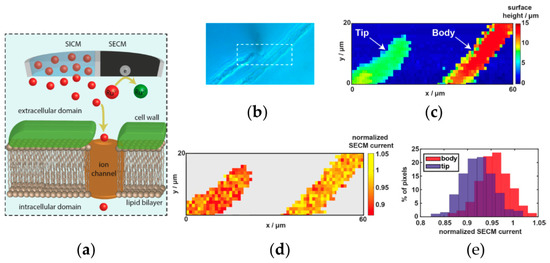 K+-selective nanoelectrodes were used to simultaneously image topography and K+ flux using SECM. (a) Optical microscopy image of a glass capillary used as an ion-selective nanoelectrode for SECM. (b) SEM micrograph of the same tip. (c) Topography image. (d) Maximum gradient of the sample surface image. (e) SECM current image of HEK293 cells. (Adapted with permission from Reference [98]. Copyright (2014) American Chemical Society).