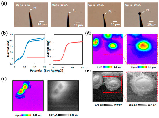 Dual barrel SECM-SICM probes are used to image immunocytochemically-stained EGFR proteins on A431 cells. (a) SECM-SICM probes with Pt sphere electrodeposited on the carbon SECM nanoelectrode, with increasing (left–right) amount of Pt deposition. (b) Cyclic voltammogram of a bare carbon nanoelectrode (red) and a Pt-deposited probe (blue) at −10 nA final deposition. (c) Topographic (left) and electrochemical (right) image of A431 cells acquired using a bare carbon electrode over an 80 × 80 µm scan area. (d) Topography and (e) electrochemical images of a A431 cells acquired using a Pt-deposited electrode, where the scan area is 75 × 75 µm on the left and 50 × 50 µm on the zoom-in (right). (Adapted with permission from Reference [75]. Copyright (2015) American Chemical Society).