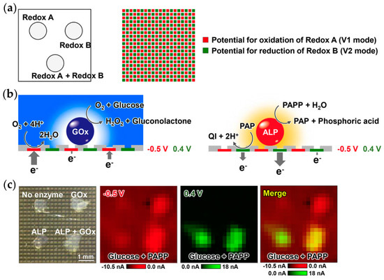 Matsue and coworkers [135] have been instrumental in developing this type of imaging platform, with the most widely used application being interrogation of 3D cultured cells using electrochemical chip devices. Microelectrode arrays require time-consuming and sophisticated fabrication methods. Also, the interelectrode spacing is an important factor that governs spatial resolution, since electrodes need to be sufficiently separated to avoid chemical cross-talk between adjacent electrodes. To enhance the ability of the sensor array device, the approach has been extended to offer simultaneous multi-reaction imaging. In electrochemicolor imaging, two (or more) different potentials are applied at alternate electrodes within the array (Figure 9) [136]. Alternate potentials can be applied at alternate electrodes on the device (V1 and V2 modes in Figure 9), with only moderate loss of imaging spatial resolution, using a mathematical approach to fill in the now “missing” pixels. Importantly, current is measured simultaneously at all pixels, so temporal resolution is not affected. This is demonstrated for the simultaneous imaging of activities of glucose oxidase (GOx) and alkaline phosphatase (ALP) at enzyme membranes (Figure 9) as a proof of principle, and for mouse ES cell cultures (embryoid bodies). The enzymatic reaction of glucose oxidase (GOx) with glucose consumes O2, leading to a lower measured current associated with O2 reduction at the electrode surface, which was held at a potential of −0.5 V. Similarly, alkaline phosphatase (ALP) reacts with p-aminophenol phosphate (PAPP) to form p-aminophenol (PAP), which was measured electrochemically at the electrode surface by oxidation to p-quinone imine (QI). These indirect measurements of non-electrochemically active species are common for biosensor platforms, and the ability to hold different potentials for different electrodes within an array partly overcomes the problem of selectivity, since it is possible to monitor multiple biomolecules simultaneously. Furthermore, images acquired using this platform show the activities associated with two molecules, using two color scales to differentiate between the electrode potential at which the current was collected.