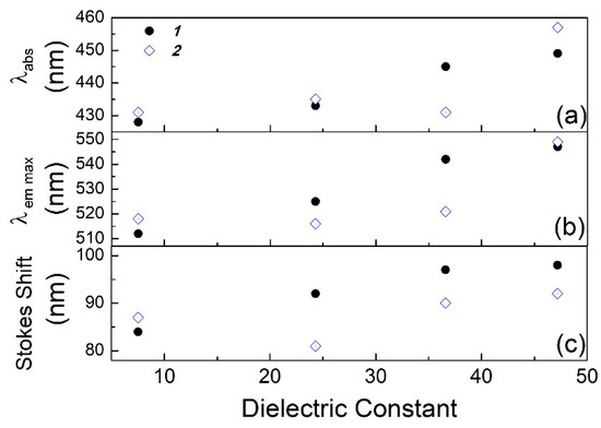 λabs (a), λem max (b) and the Stokes shift (c) in function of the dielectric constant for compounds 1 and 2 are presented for different solvents.