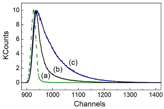 For comparison, the free fluorescein in alkaline aqueous solution (pH 12.8), the transient emission was a good fit with just a single exponential with a value of (4.06 ± 0.01) ns and χ2 = (1.1 ± 0.1), in agreement with the reported results. For example, for the sodium fluorescein dianion, the value was 4.16 ns [21]; for fluorescein in 0.1 M and 0.01 M NaOH, the values were 4.02 ns [41], and (4.0 ± 0.2) ns [13], respectively. For compounds 1 and 2 in alkaline aqueous solution (pH 12.8), the fluorescence transients, as expected, also fit well with just one exponential (Figure 4c), and the obtained lifetimes were (4.06 ± 0.01) ns and (4.08 ± 0.02) ns, respectively.