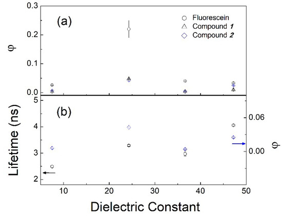 In addition, the relative quantum yield of fluorescence was determined for both compounds; the results are presented in Figure 5a as a function of the dielectric constant of the solvents. However, the φ values for compounds 1 and 2 and fluorescein in THF, acetonitrile, and DMSO were low, in agreement with the results of other studies of fluorescein and its derivatives [2,6,12,18]. The decreases of φ values for fluorescein derivatives have been reported and attributed to the photoinduced electron transfer due to a group linked to the fluorophore of the xanthene or phenyl ring [42]. Figure 5b shows the behavior for the lifetime and φ of compound 2 as a function of the dielectric constant.