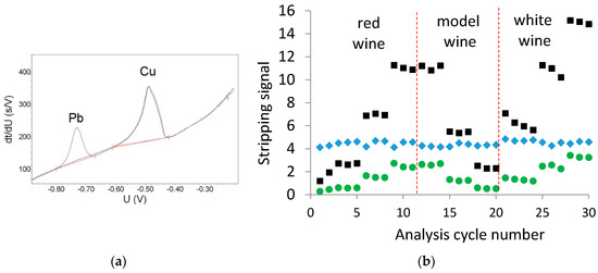 Pb as an internal standard: (a) potentiogram of 0.080 mg/L Cu in model wine with and without 2.0 mg/L Pb in the ethanol-based washing solution; (b) Cu (■), Pb (♦) and the normalized Cu (●) stripping signals obtained during the analysis of red, white, and model wines on a single electrode. The order of analysis is red wine with additions of 0, 0.040 and 0.080 mg/L Cu; model wine with additions of 0.080, 0.040, and 0.020 mg/L Cu; and the white wine with additions of 0, 0.040 and 0.080 mg/L Cu.
