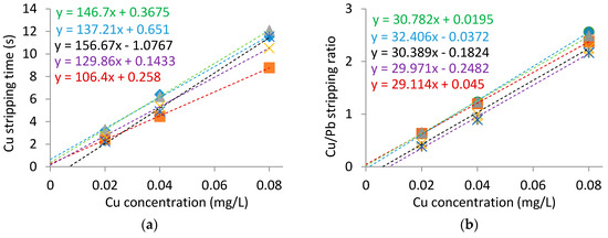 Cu calibration graphs in model wine: (a) utilizing copper stripping time; (b) utilizing the Cu stripping time normalized to the Pb stripping time.