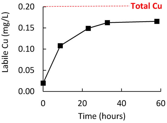 Labile Cu concentration during the stirring white wine (750 mL) at room temperature and under ≈1.5 L of air ullage. Error bars are the standard deviation but are smaller than the data symbols.