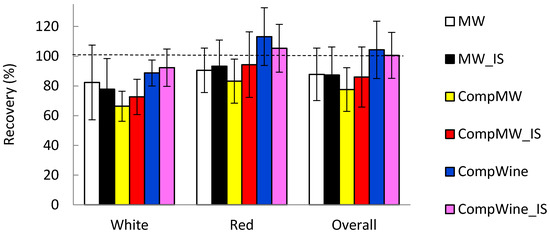 The recovery of 0.04 mg/L Cu in wines by the different quantitation methods. The error bars represent the standard deviation (n = 5 for white wines, n = 7 for red wines and n = 12 for overall wines).