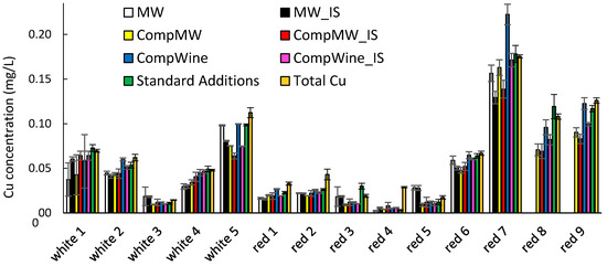 The recovery of 0.040 mg/L Cu added to the pretreated wines was conducted in order to establish any matrix effects encountered by the different modes of quantitation. This concentration was preferred, given that it is relevant to concentrations of labile Cu observed in freshly opened bottled wines [11]. The recovery results shown in Figure 4 are based on the analysis of five white wines and seven red wines.
