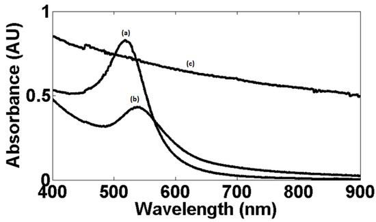 The absorption spectra (Agilent Cary 60 UV–vis spectrophotometer, Agilent, Santa Clara, CA, USA) clearly shows the plasmon of GNPs at 520 nm which is red shifted to 540 nm (as shown in Figure 3) after modification with wsMWCNTs while it is completely absent for wsMWCNTs. The red shift in plasmon is attributed to the interaction of GNPs with wsMWCNTs.