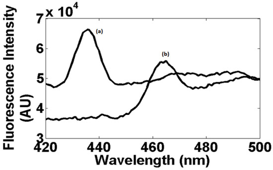 The fluorescence spectrum (Nikon Eclipse Ti-U, Nikon Instruments, Melville, NY, USA) of wsMWCNTs shows a clear maximum at 430 nm which is due to the surface passivation of the MWCTs. The spectrum is red-shifted to 470 nm (as shown in Figure 4) after decorating with GNPs. Indirectly, the red-shift clearly carries the signature of gold nanoparticle conjugated wsMWCNTs.
