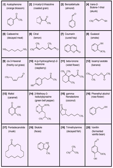 - Ferreira, V. Revisiting psychophysical work on the quantitative and qualitative odour properties of simple odour mixtures: A flavour chemistry view. Part 2, qualitative aspects. A review. Flavour Fragr. J. 2012, 27, 201–215. [Google Scholar] [CrossRef]