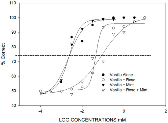 Figure 2. Odor mixture interactions: vanilla plus background. Near-threshold background stimuli affected vanilla odor detection. Background odors were at a constant 0.032 mM concentration. With the exception of l-menthol, vanilla odor detection threshold in mixtures increased by 1 log unit (vanillin + phenethyl-alcohol, p = 0.0001; vanillin + phenethyl − alcohol + l-menthol, p = 0.0001). Vanilla-odor detection threshold possibly increased in presence of background containing rose odor because of olfactory-bulb glomerular competitive mutual suppression. The mint background did not affect vanilla detection. Menthol also elicits a cool sensation. Whether stimuli with trigeminal components behave differently from pure odors in mixtures has not been tested. From [2].