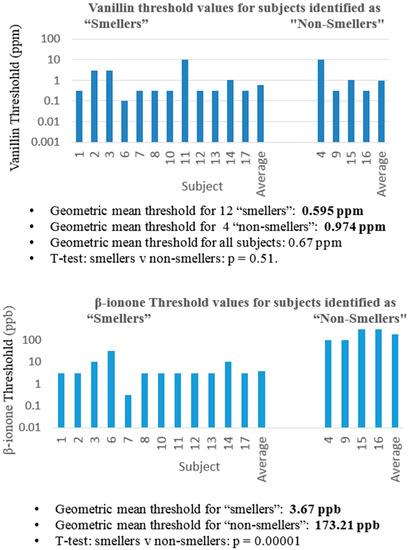 Figure 3. Odor mixture interactions: genetics. Vanillin thresholds do not differ for ‘smellers’ and non-smellers of β-ionone. β-ionone thresholds for ‘non-smellers’ are all higher than thresholds for ‘smellers’. From [22]. The β-ionone smeller detects a ‘violet-flower’ odor; whereas, the non-smeller detects ‘woody’. Results are generally consistent with McRae et al. [23], who found ‘non-smellers’ of β-ionone to have a threshold more than an order of magnitude higher than ‘smellers’.