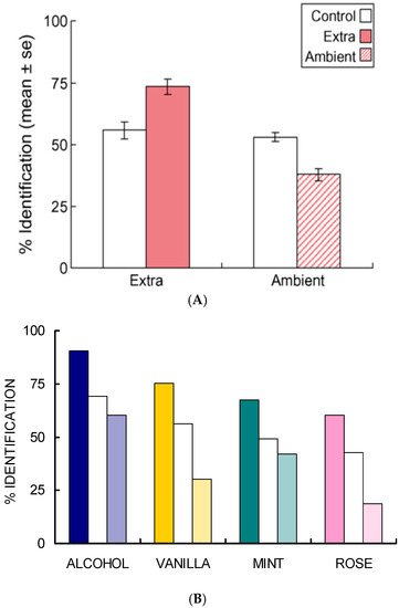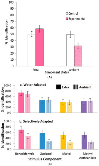 Figure 4. Selective adaptation of alcohol, vanilla, mint and rose odors in 2, 3, and 4 component mixtures. (A) Correct identification increased for newly introduced extra stimuli, p < 0.0001, but decreased for continuing ambient stimuli, compared to controls, p < 0.001. (B) Extra component identification is greater (solid color bars) and ambient component is poorer (striped color bars) than controls (white bars). From [26] with permission from Elsevier.