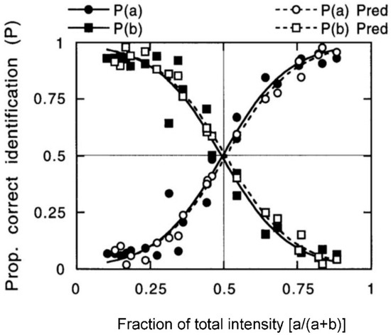 In his analysis of binary odor mixtures, Ferreira [16] concluded that in a typical or average case, the ratio of identification probabilities is about 2 when the component intensities in isolation are in the ratio of 59/41 or about 1.4 or the square root of 2. This fits with the general equation of Olsson and Cain [17]. Ferreira also considered that one component would be dominant when the ratio of identification probabilities is 2 or more. Thus, one component will dominate the other by at least a factor of 2 if its intensity is 59% or more of the summed intensities of the components.