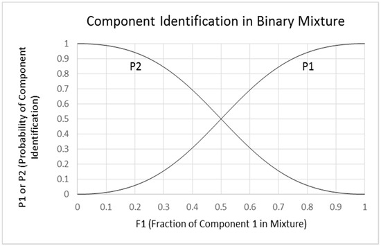 We developed a model for the identification of components within a binary mixture starting with the general equation of Olsson and Cain [17] which relates the probability of identification of a component P1 as a function of the composition of the binary mixture. We use the same equation of Olsson and Cain, but with different symbols (Equation (1)). P1 is the probability of component 1 identification in the mixture and F1 and F2 are the fractional intensities of the mixture components. We replaced F22 with its equivalent (1 − F1)2 to give Equation (2-1) for P1 and Equation (2-2) for P2 having a single independent variable F1. Note that P1 + P2 = 1 and F1 + F2 = 1.