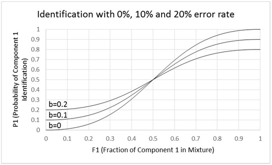 - Misidentifications. Though Ferreira did not consider identification errors in explaining the logistic fits, it is likely that the flat functions are due to misidentifications. We show in Figure 8 examples of how this could occur. We made pragmatic adjustments of Equations (2-1) and (2-2) to develop Equations (4-1) and (4-2), which show increasing flattening of the sigmoid function with increasing error rate defined by intercept b. The slope at the inflection point is 2(1 − 2b). When b = 0, the curve is identical to that shown in Figure 8 with a slope of 2. When b = 0.1, the slope is reduced to 1.6, and when b = 0.2, the slope is 1.2. This result suggests that the flattening of the function can be due to identification errors rather than a change in the exponent of the fractional component intensity. It also indicates that analysis of mixtures with extensively overlapping odor qualities would be difficult. Analysis of mixtures works best when odors are orthogonal and non-overlapping. An exponent of 2 for the fractional component intensities in binary mixtures may be a general property for orthogonal odorants.