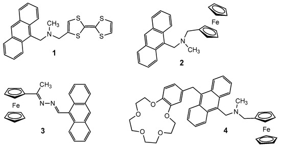 Molecules 1 and 2 function as fluorescent AND logic gates [9,10]. They share the same design characteristics according to a fluorophore–spacer1–receptor–spacer2–electron donor format (Figure 1). These molecules are PET-based devices with two methylene spacers, a tertiary amine receptor and an electron donor, tetrathiafulvalene and ferrocene, for 1 and 2, respectively. On protonation of the amine and oxidation of the electron donor, 1 and 2 emit a blue fluorescence visible to the naked eye. A ‘turn-on’ response of five-fold was observed for both in acetonitrile, and in methanol for 2. The original prototype 1 [10] was observed to undergo fluorescence quenching beyond stoichiometric Fe3+ levels resulting in an ‘off-on-off’ behavior. Prototype 2 alleviated this issue as higher Fe3+ levels did not cause a drastic fluorescence quenching. A predecessor by Yan 3 connects the anthracene and ferrocene modules by a 2,3-diaza-1,3-butadiene bridge and uses trifluoroacetic acid and Ce4+ as the proton source and oxidant, respectively, in THF [21].