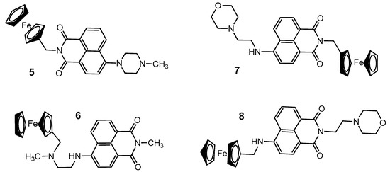 - Gan, J.; Tian, H.; Wang, Z.; Chen, K.; Hill, J.; Lane, P.A.; Rahn, M.D.; Fox, A.M.; Bradley, D.D.C. Synthesis and luminescence properties of novel ferrocene–naphthalimides dyads. J. Organomet. Chem. 2002, 645, 168–175. [Google Scholar] [CrossRef]