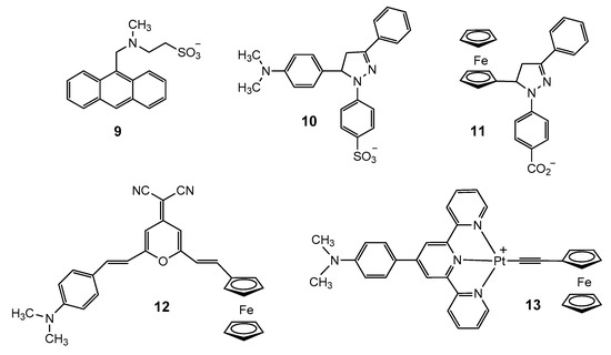Zhu reports a dicyanomethylene-4H-pyran 12 with conjugated dimethylaniline and ferrocene moieties that in THF emits at 610 nm on addition of one equivalent of Fe3+ [43]. It is suggested that the fluorescence is regulated by both PET and ICT mechanisms. The study includes cyclic voltammetry and time-resolved fluorescence measurements in addition to DFT calculations. Examined as a redox-fluorescent switch, the fluorescence enhancement exceeds 100-fold. Regrettably, though, the authors do not report the effect of acid on the fluorescence modulation, and consequently, the built-in two-input logic gate features.