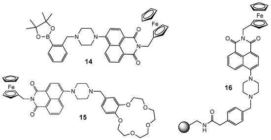 A three-input combinatorial INHIBIT logic gate 14 was demonstrated by James and co-workers using a ferrocene-naphthalimide-boronic acid conjugate (Figure 4) [45]. A high fluorescence output was observed in the presence of ‘high’ Fe3+, ‘low’ sodium L-ascorbate and ‘low’ F−. Minimal fluorescence output is observed with no added chemical inputs on excitation at 403 nm in THF. One equivalent of Fe3+ is sufficient to oxidize the ferrocene moiety and to cause a 100-plus fluorescent enhancement centred at 512 nm. Fluoride acts as a nucleophile to form a tetrahedral boronate anion, which causes a delayed fluorescence enhancement, possibly due to an ion pair interaction between Fe3+ and F−.