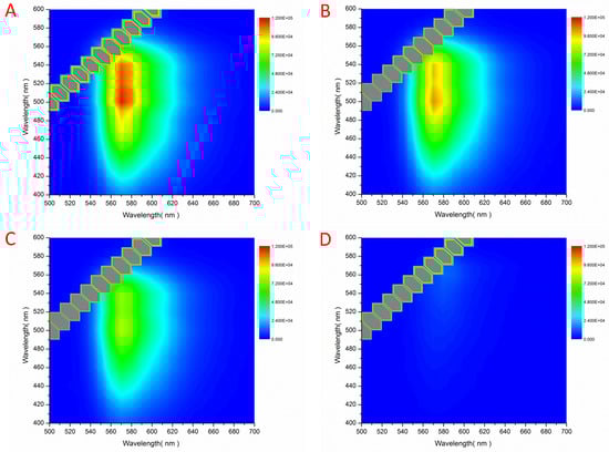 Fluorescence excitation/emission matrix scans of the water phase for Pb2+ ion concentrations of: (A) 0 (B) 10 ppt (C) 500 ppt (D) 500 ppm. Note that the intensity scales are set the same.