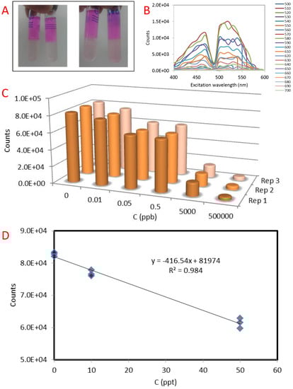 Figure 1 shows test-tubes with separated solutions with zero and 500 ppm lead ions. Also, the proposed sensing mechanism is illustrated in Figure 1, where the Benzo-18-Crown-6-ether collects Pb2+ ions and ion pairs with two Merocyanine 540 (one negative charge each) molecules and co-extracts into the less polar octanol phase, with consequent de-colorization and fluorescence decrease in the water phase. Resulting excitation/emission fluorescence matrices are shown in Figure 2A–D for 0/10/500 ppt and 500 ppm lead ions, and a declining fluorescence trend is realized. Another Pb2+ ionophore (Lead IV, Selectophore) was tested in the same way with much lower responses. Naked eye detection of 500 ppt lead ions was assessed with both ionophores and pictures are shown in Figure 3A, with an advantage for Benzo-18-Crown-6-ether. This is an indication that all ionophores will not perform on this high level by default in this set-up.