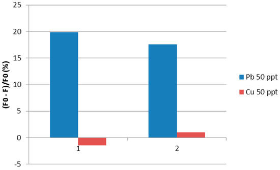 Relative fluorescence signal response for duplicate samples of 50 ppt Pb2+ (blue) and Cu2+ (red), respectively. Benzo-18-Crown-6-ether was used as ionophore for both ions.