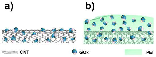 Structure of (a) carbon nanotube (CNT)/ glucose oxidase (GOx) and (b) CNT/PEI (polyethyleneimine)/GOx catalyst.