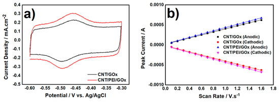 (a) CV curves of CNT/GOx and CNT/PEI/GOx at scan rate 100 mV·s−1. Linear trend between peak current vs. scan rate ranging from 100 to 1600 mV·s−1 (b). All experiments were conducted under anaerobic condition by feeding N2 gas at 100 mL·min−1 and 0.1 M Phosphate Buffer Saline (PBS) pH 7.4 acted as the electrolyte.