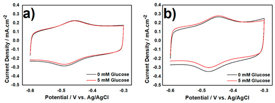 CV curves of (a) CNT/GOx and (b) CNT/PEI/GOx at scan rate 100 mV·s−1 with absence (black) and presence (red) of 5 mM glucose in the electrolyte. All experiment conducted under aerobic condition and 0.1 M PBS pH 7.4 acted as the electrolyte.
