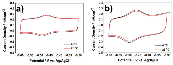 The effect of two storage temperatures (4 °C and 25 °C) on the activity of GOx in catalytic structures, for durability study, was investigated and quantified by CV measurements under anaerobic condition, as shown in Figure 4a,b. The FAD/FADH2 redox peaks from CNT/GOx and CNT/PEI/GOx stored at room temperature (25 °C) are lower, compared to biocatalysts stored at a cool temperature (4 °C). The decreasing in peaks current density is related to two factors: (i) Denaturation of proteins in the active site of GOx and (ii) strength of bonds in biocatalyst during the storage process. The peak current density of CNT/GOx stored at 4 °C and 25 °C decreased by 19.09% and 26.22%, respectively, and peak current density of CNT/PEI/GOx decreased by 6.76% and 13.93%, respectively, from the initial value.