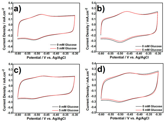 CV curves of (a) CNT/GOx and (b) CNT/PEI/GOx stored at 4 °C; CV curves of (c) CNT/GOx and (d) CNT/PEI/GOx stored at 25 °C for 120 days. Scan rate is 100 mV·s−1 in the absence (black) and presence (red) of 5 mM glucose in the electrolyte. All experiment conducted under aerobic condition in 0.1 M PBS pH 7.4 as the electrolyte.
