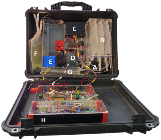 Picture of the autonomous sensing platform. (A) Inlet system, (B) bags holding sample, high calibration standard, and low calibration standard, (C) detection chamber housing the microfluidic chip, LED (375 nm), and photodiode, (D) poly(methyl methacrylate) (PMMA) fluidic board, (E) battery, (F) reagent Bag, (G) waste bag and (H) electronics.