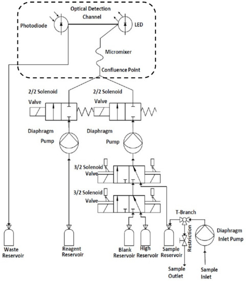 - Cleary, J.; Slater, C.; McGraw, C.; Diamond, D. An autonomous microfluidic sensor for phosphate: On-site analysis of treated wastewater. IEEE Sens. J. 2008, 8, 508–515. [Google Scholar] [CrossRef]