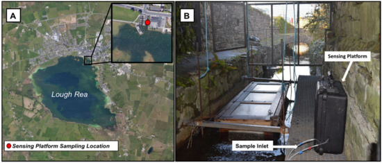 (A) Satellite image of the sampling location at Loughrea Co., Galway, Ireland. (53°11′47.5″ N: 8°34′6.8″ W) [19]. (B) Picture of the prototype sensing platform deployment at Lough Rea angler’s fish hatchery, Loughrea Co., Galway, Ireland.
