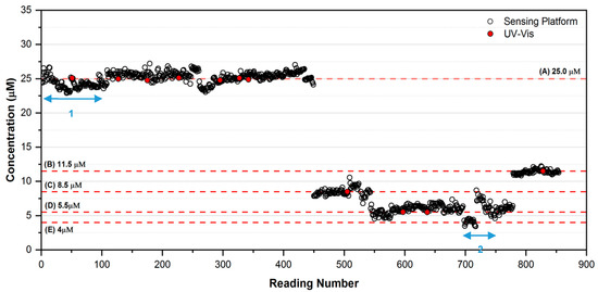 The purpose of this study was to stress-test and optimise the platform in fully autonomous operational mode prior to initiating field deployments. The measurement cycle (ca. 90 min) consisted of (i) a blank solution measurement (0 µM PO43−), (ii) a high standard measurement (50 µM PO43−), and (iii) a sample measurement. During the study, the platform automatically generated 854 measurements of each test solution, blank and high standard, totalling 2562 measurements, along with a further 40 spiked solution measurements of varying concentration ranges (with associated blank and standard high calibrations, i.e., 120 measurements) at regular intervals to test the system response (not shown for clarity), totalling 2682 measurements in all. The concentration of PO43− in the 25 L sampling tanks was varied in the sequence between 25.0 µM, 8.5 µM, 5.5 µM and 11.5 µM PO43− to validate the response of the platform. Figure 6 shows the platform response obtained over the entire test period. The red dots, representing the PO43− concentrations determined using the UV-Vis Spectrophotometer reference method, are clearly in excellent agreement with the concentrations determined by the sensing platform (see also Table 2). Overall, the response of the platform was encouraging, with the response remaining reasonably consistent with the reference measurements throughout. However, several issues were identified that had to be addressed through fault finding, software debugging and component changes during the study (see below).
