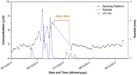 Following extensive lab trials, the system field performance was assessed through a deployment during which it operated in completely autonomous mode at a location around 150 miles from the laboratory. Figure 7 shows the phosphate concentration data generated during the deployment at Loughrea Lake, Co., Galway, Ireland. During the five day deployment, a total of 165 in situ measurements (i.e., 55 sample, 55 blank (0 µM) and 55 high standard (50 µM)) were obtained. Data were transmitted wirelessly to an online interface via a GPRS module, and also stored on an 8 GB SD card connected via a Data Logger Arduino Shield as backup. The sample was filtered through a 0.45 µM filter membrane at the inlet which remained un-changed throughout the deployment. During the deployment, the phosphate concentrations measured by the platform ranged from 1.45 to 10.24 µM, with an average concentration during this time of 3.13 µM. Of particular interest is the observation that the highest phosphate concentrations between 6–7 December 2017 coincided with rainfall events (Figure 7).