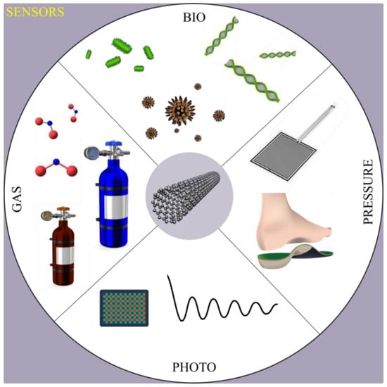 Today, CNTs are employed for many applications, encompassing the field of reinforcement [,] electronics [,,], optoelectronics [,,], sensors [,,,,,], batteries [,] and supercapacitors []. In this review, we will focus on distinguished studies that have provided notable contribution to the field of carbon nanotubes for sensing applications. In particular, we will overview the works on carbon nanotube-based gas sensors, biosensors, photo-sensors, and pressure sensors (Figure 1). As there are many outstanding studies in this topic, it was impossible to discuss them all; thus, we apologize for any possible omission.