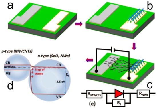 Scheme for fabrication of the hybrid heterojunction of MWCNTs and SnO2 nanowires (NWs): (a) a pair of Pt-electrodes, (b) selective growth of SnO2 NWs, (c) the deposition of MWNCTs to form the heterojunction, (d) band diagram of the heterojunctions, and (e) equivalent electronic. Reprinted from Ref. [], with the permission of AIP Publishing.